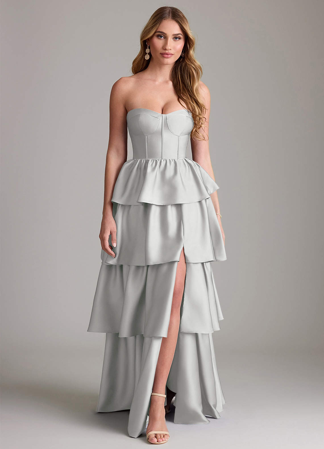 Vestido de Plata de Satén Elástico de Corte en A con Volante