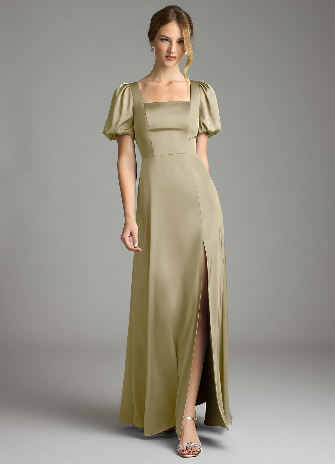 Vestido de Musgo Verde de Satén Elástico de Corte en A con Plisado