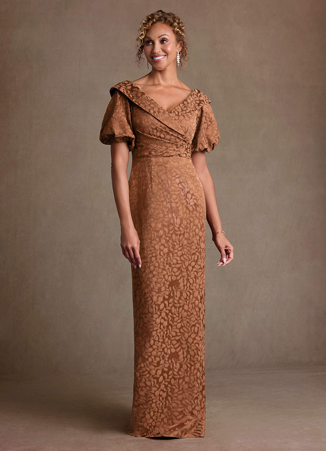 Vestido de Cacao Con Caramelo de Jacquard Floral de Corte Columna con Plisado