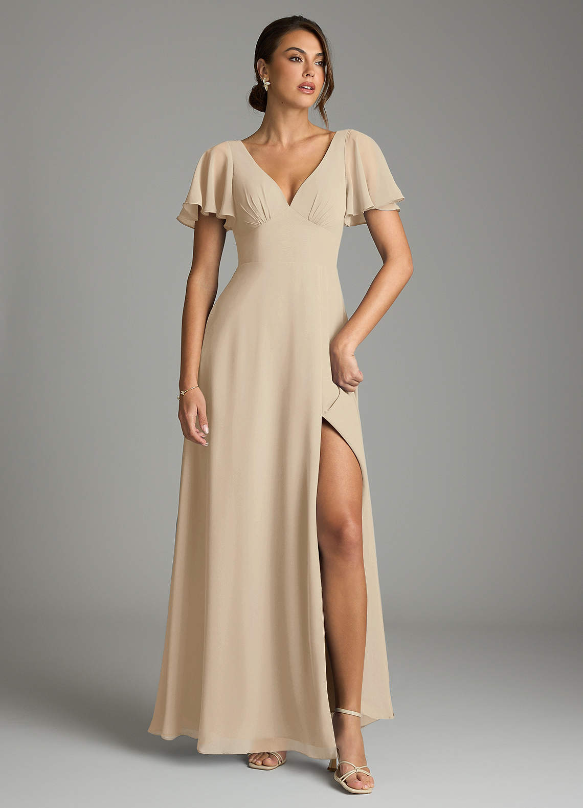 Vestido de Champán de Gasa de Corte en A con Manga volante