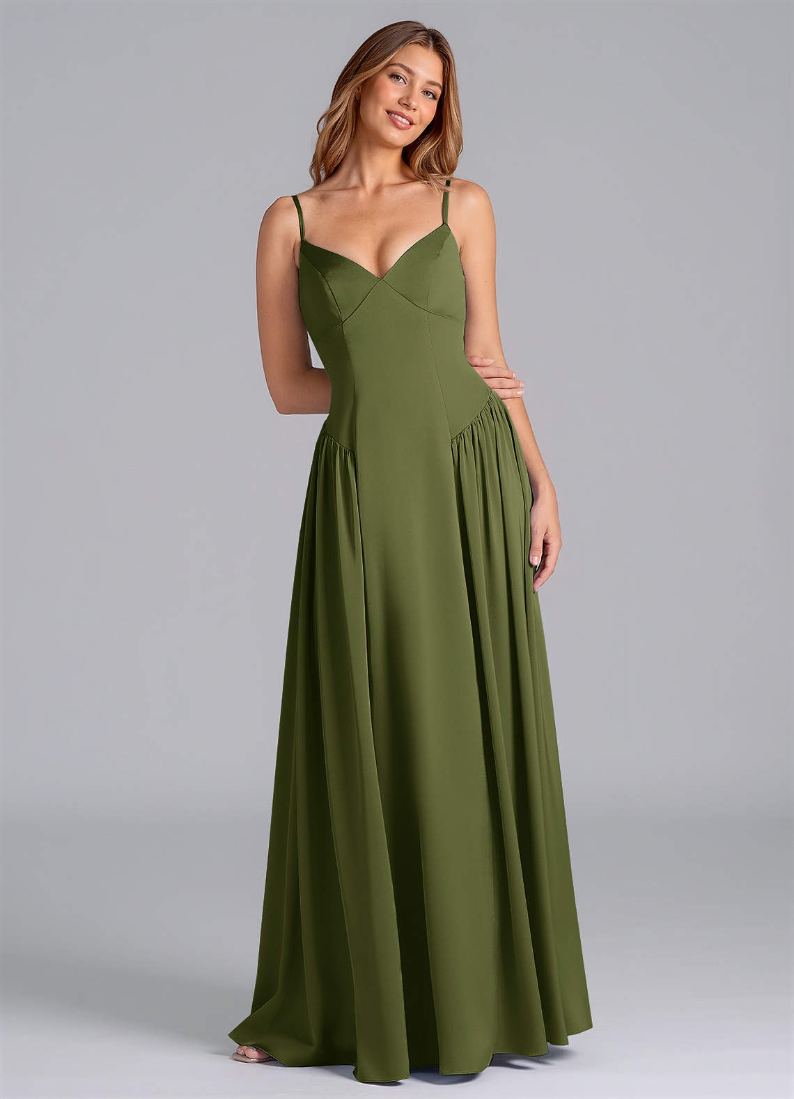 Vestido de Oliva de Satén Elástico de Corte en A