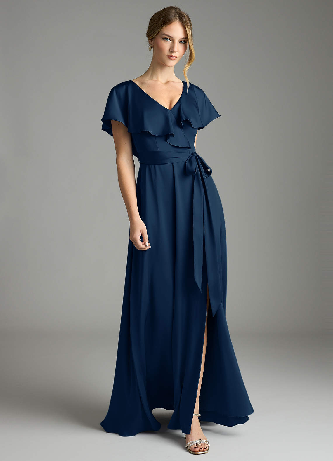 Vestido de Azul Marino Oscuro de Satén Elástico de Corte en A con Con bolsillos