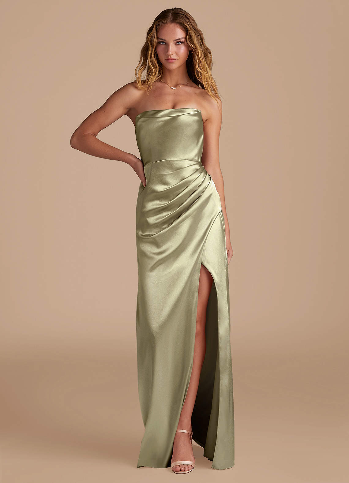 Vestido de Musgo Verde de Satén Metálico de Corte Sirena Convertible con Plisado