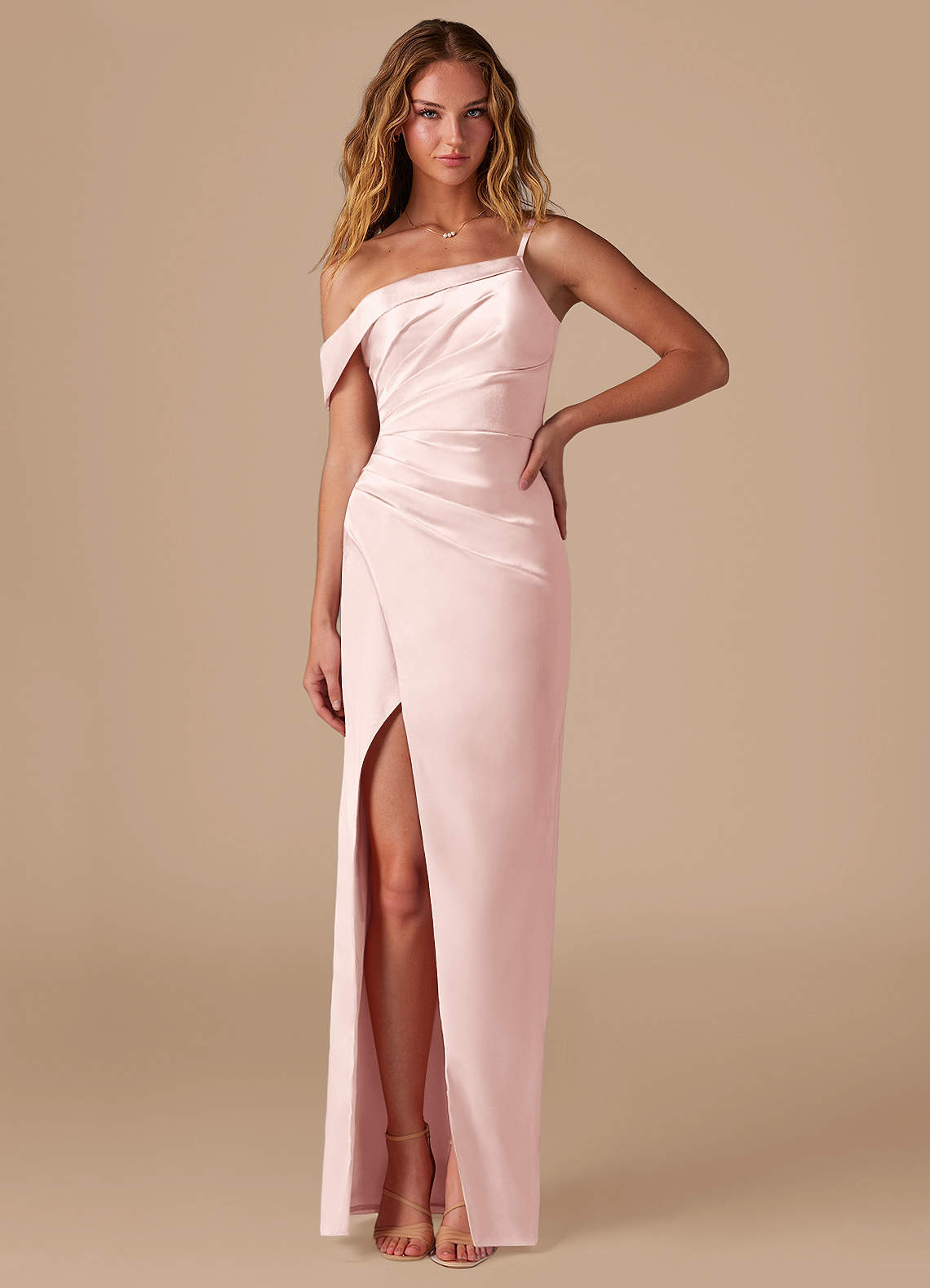 Vestido de Rosa Rubor de Satén Metálico de Corte Recto con Hombro unilateral