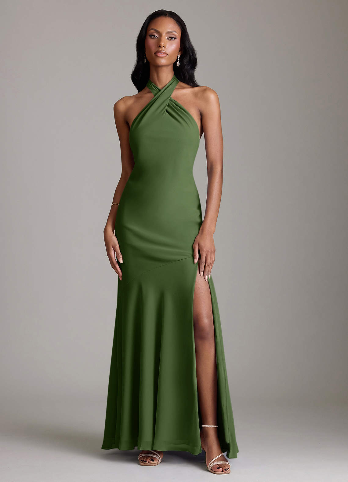 Vestido de Oliva de Gasa de Corte Sirena con Plisado
