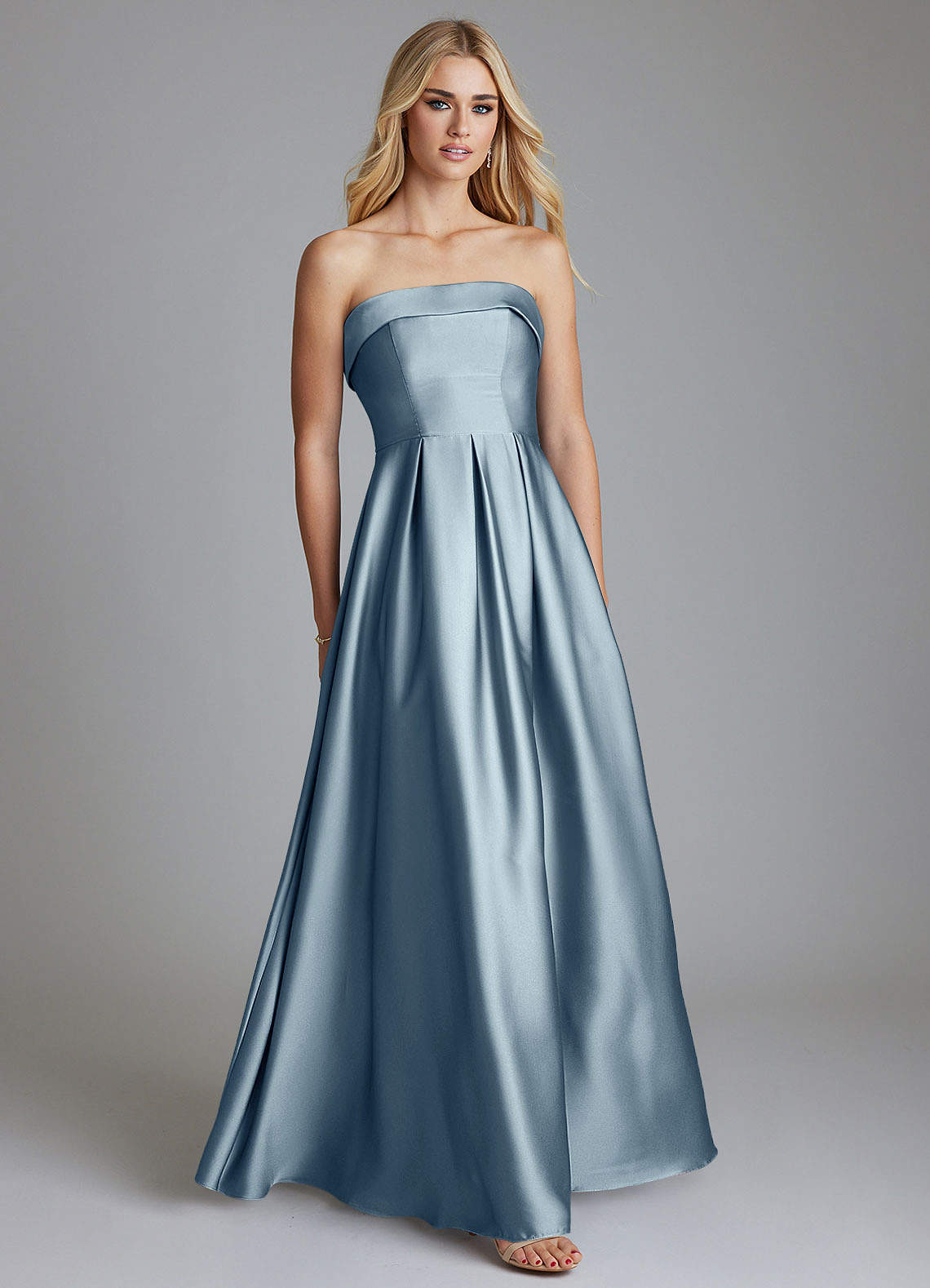 Vestido de Azul Polvoriento de Satén Elástico de Corte en A Convertible con Sin tirantes