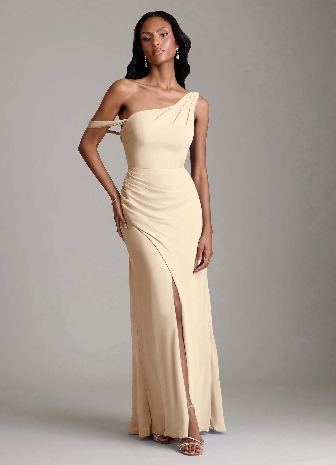 Vestido de Champán de Gasa de Corte Sirena Convertible con Hombro unilateral