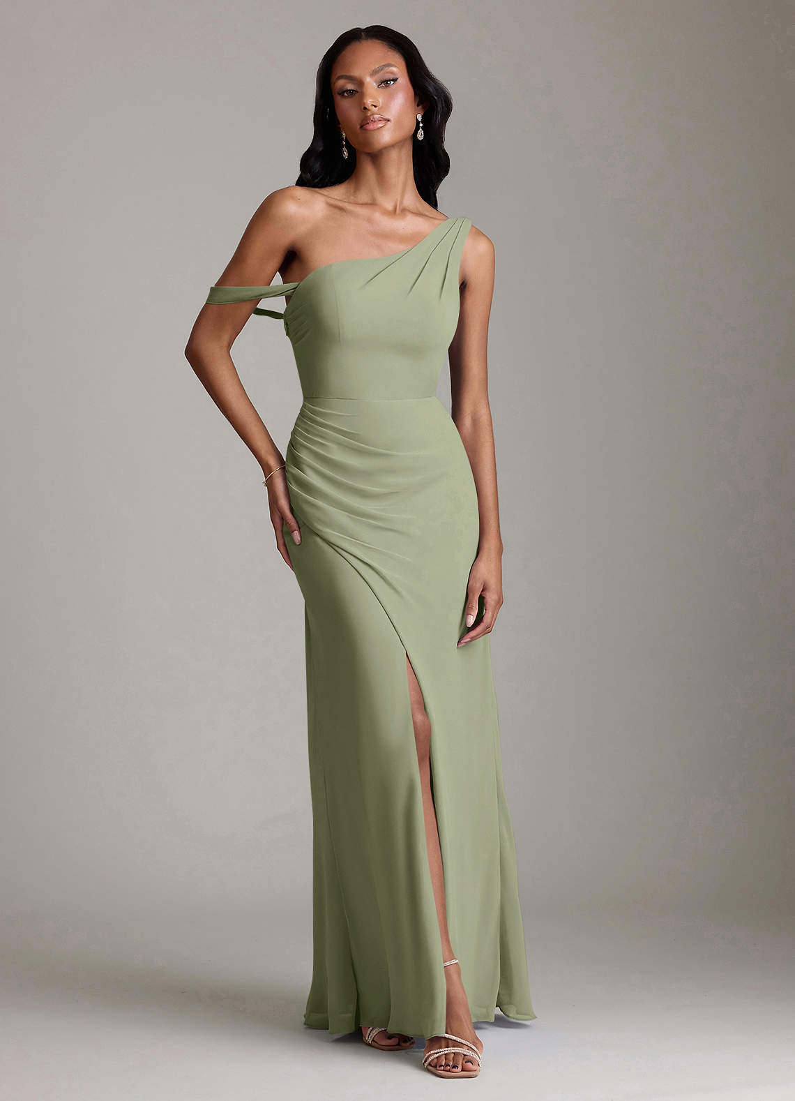 Vestido de Pistacho de Gasa de Corte Sirena Convertible con Hombro unilateral