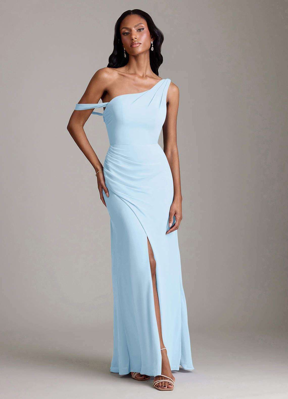 Vestido de Azul Cielo de Gasa de Corte Sirena Convertible con Hombro unilateral