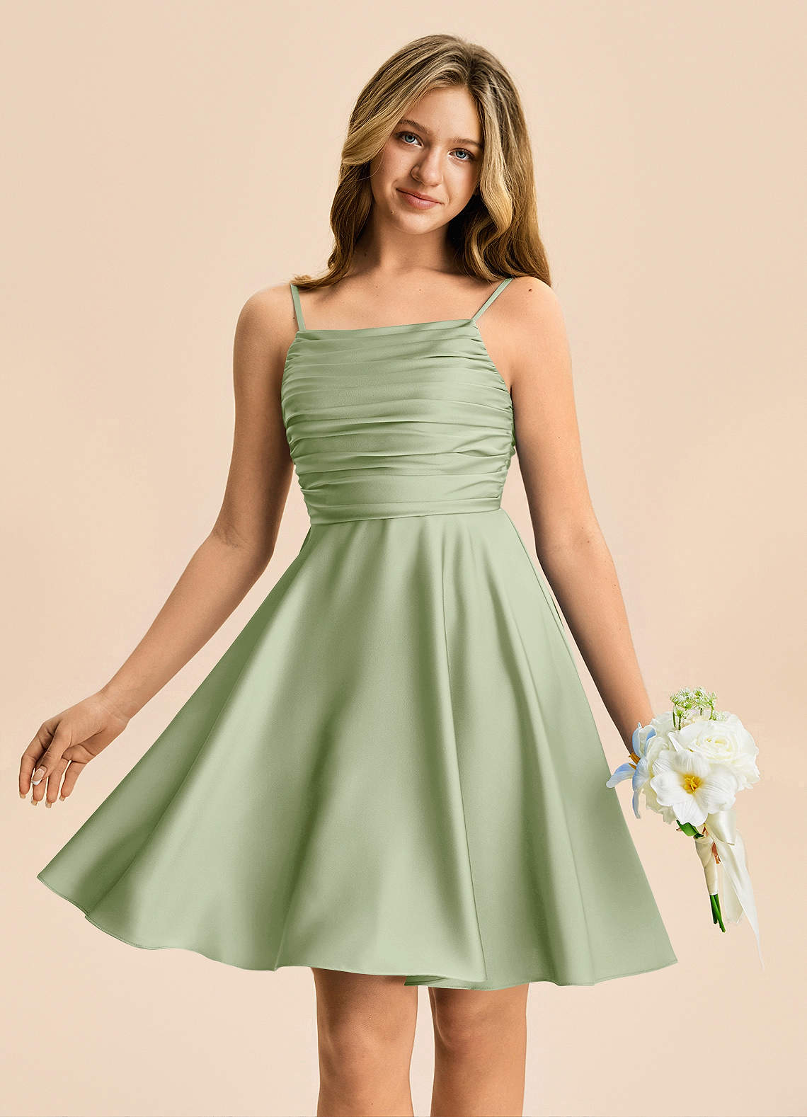 Vestido de Salvia Polvorienta de Satén Elástico de Corte en A con Plisado