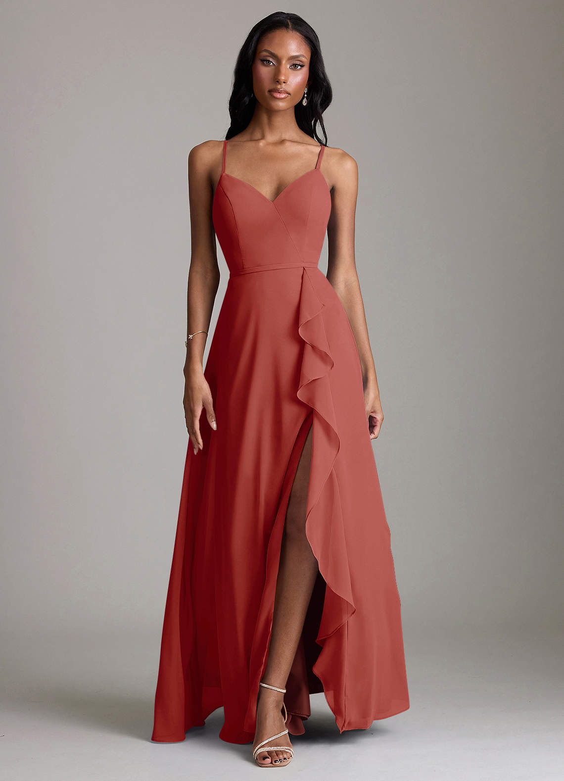 Vestido de Terracota de Gasa de Corte en A con Cuello en V fruncido