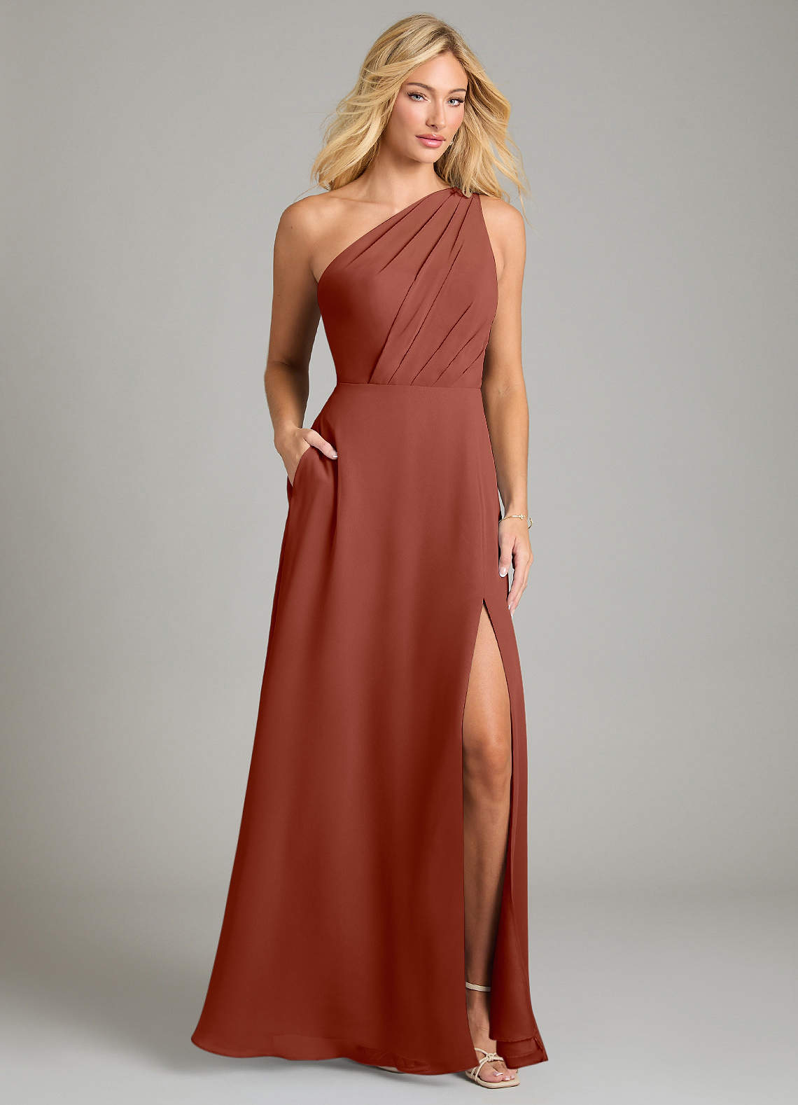 Vestido de Castaño de Gasa de Corte en A con Hombro unilateral