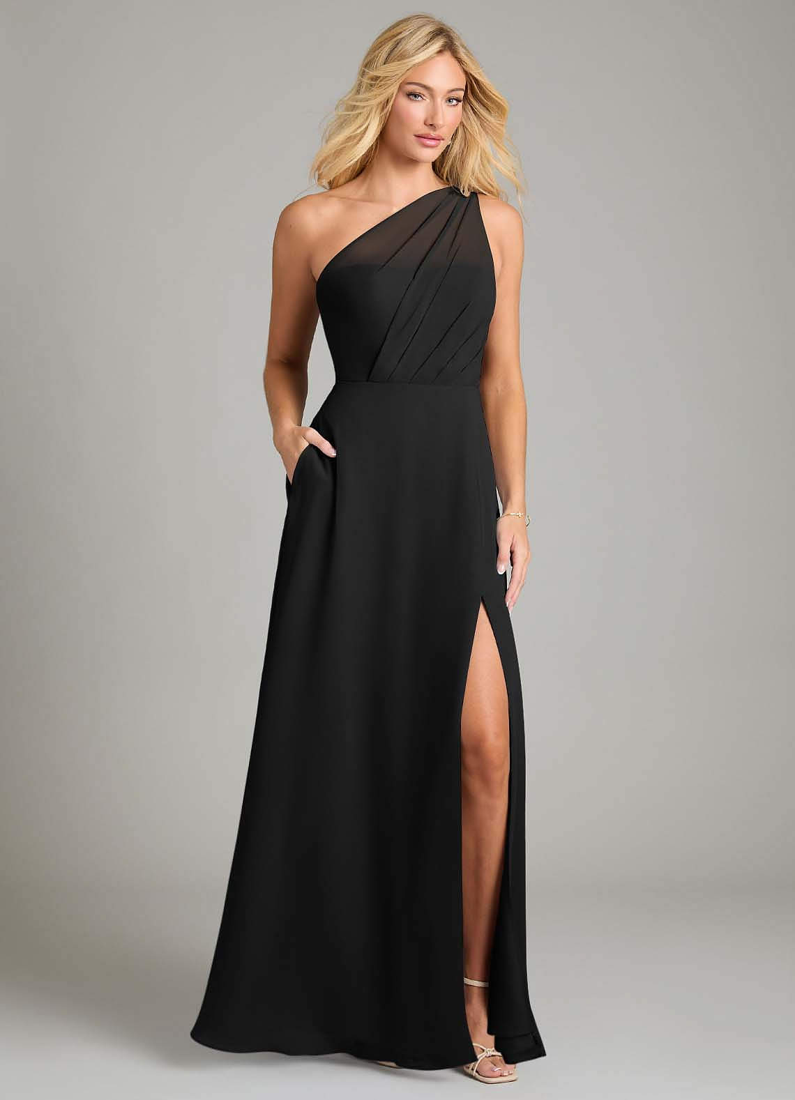Vestido de Negro de Gasa de Corte en A con Hombro unilateral