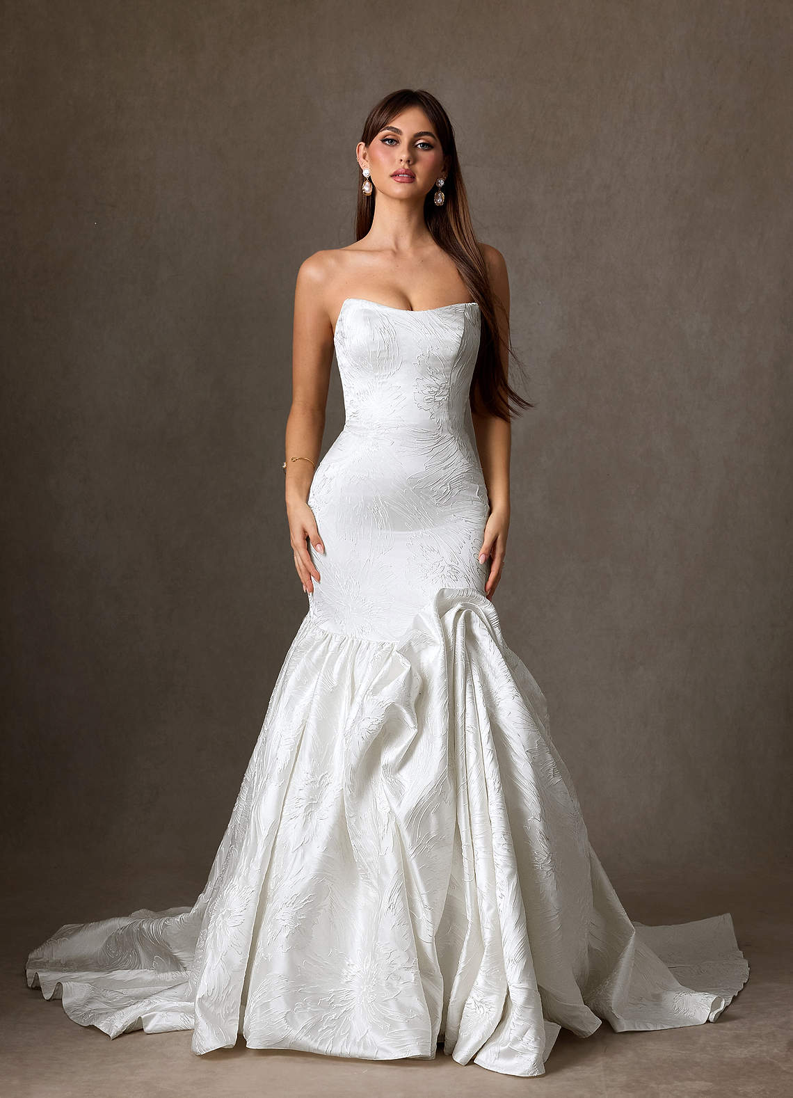 Vestido de Diamante Blanco de Jacquard Floral de Corte Sirena con Sin tirantes