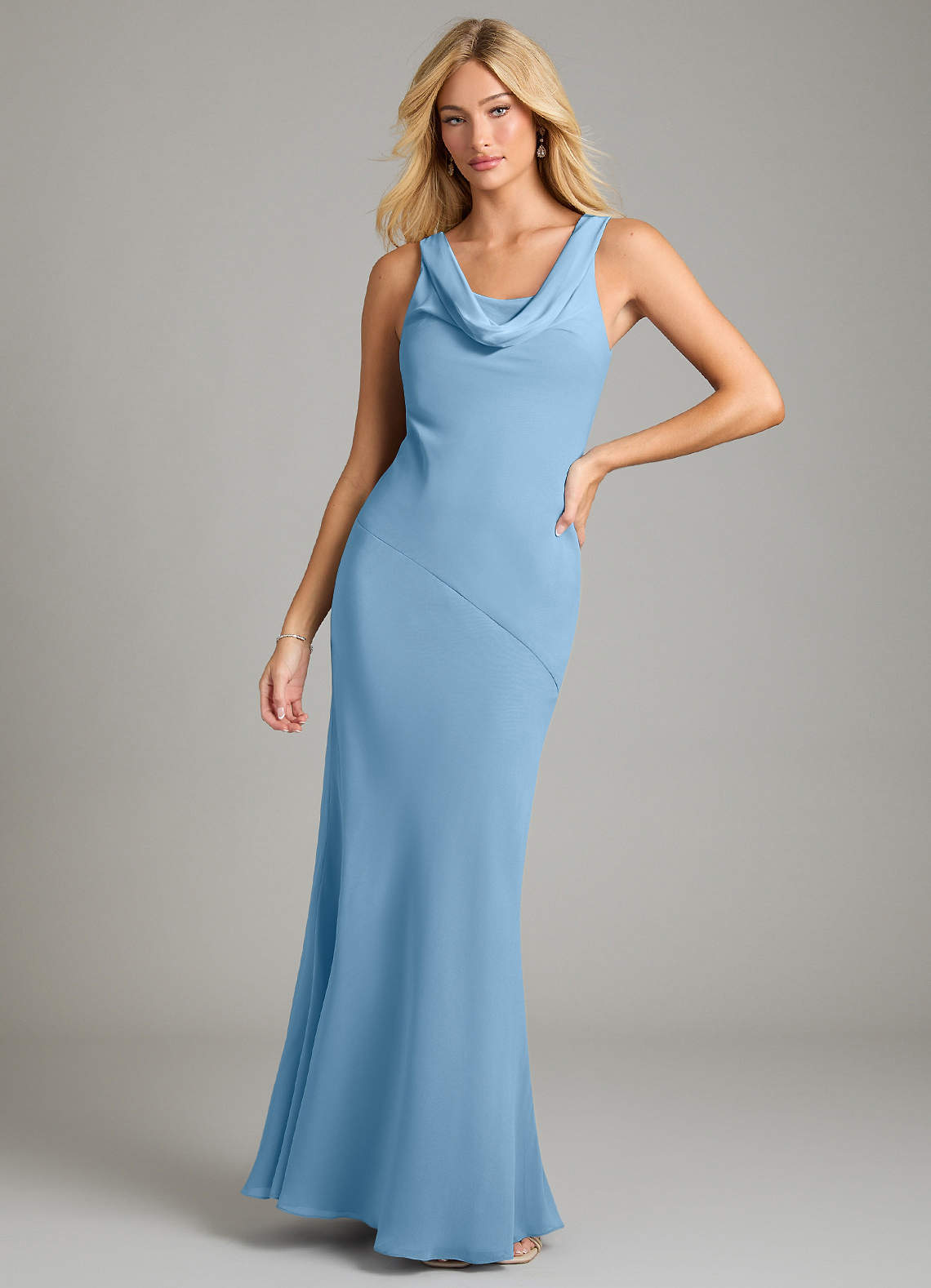 Vestido de Azul Acero de Gasa de Corte Sirena con Plisado