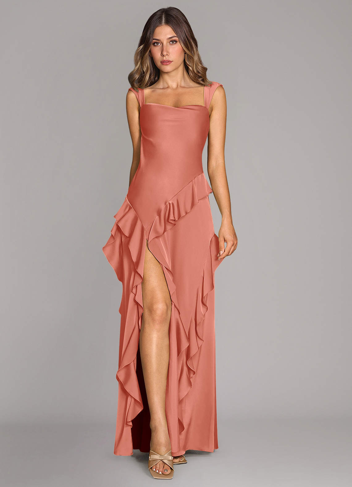 Vestido de Rosa Salmón de Satén Elástico de Corte en A con Escote de Corazón