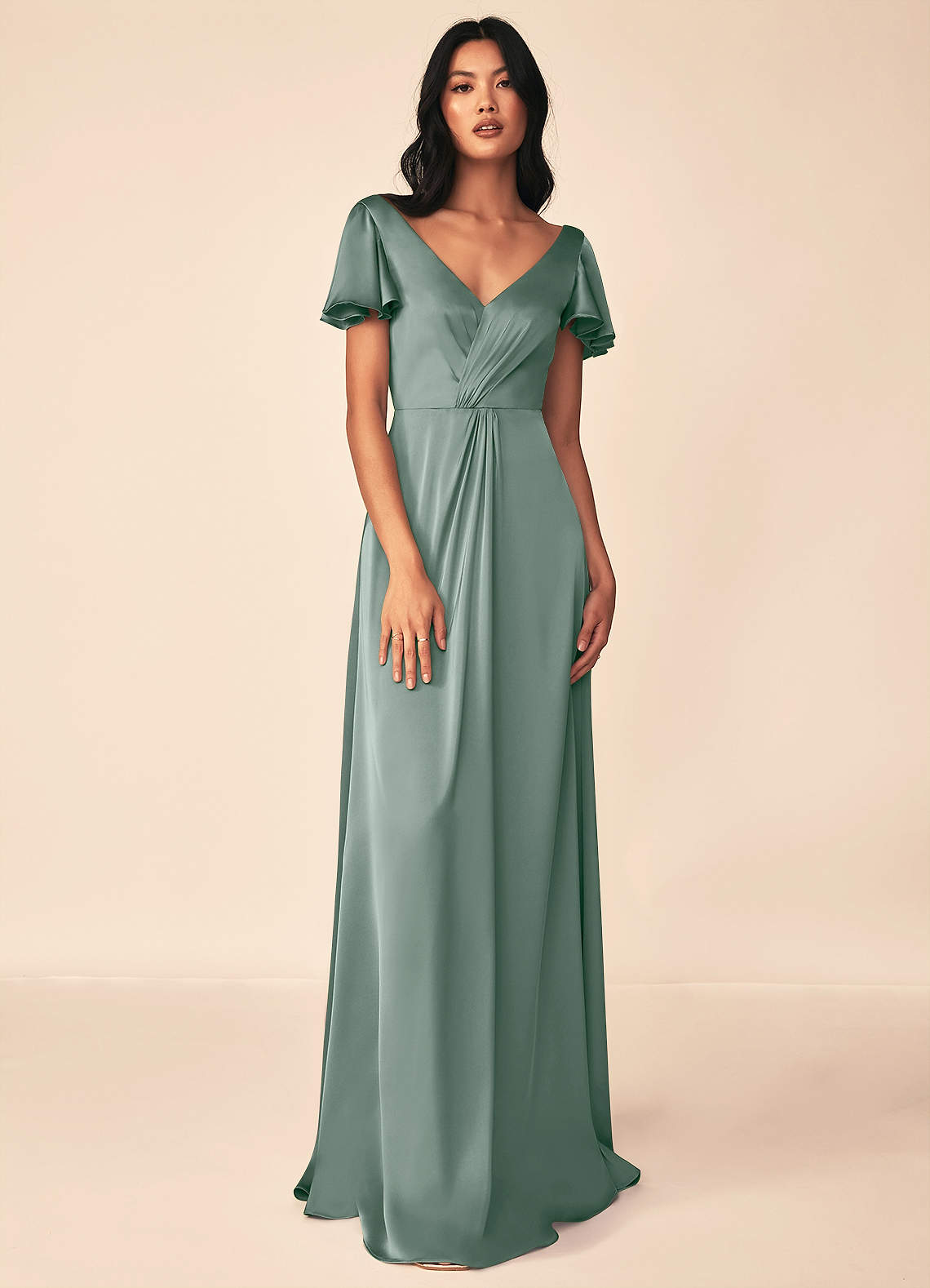Vestido de Salvia Plateada de Satén Elástico de Corte en A con Plisado