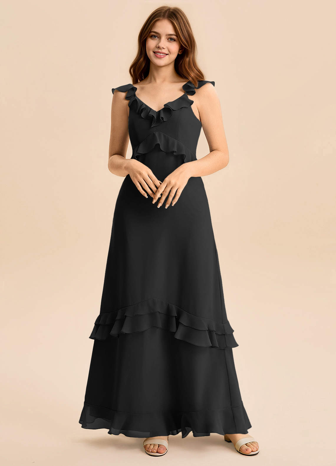 Vestido de Negro de Gasa de Corte en A con Volante