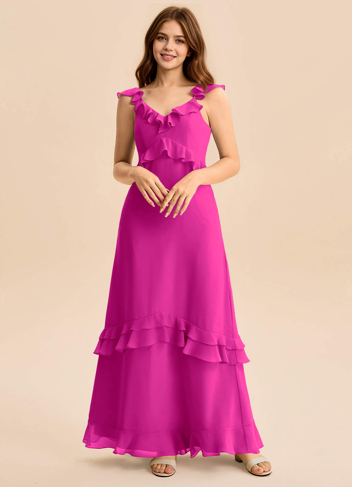 Vestido de Fucsia de Gasa de Corte en A con Volante