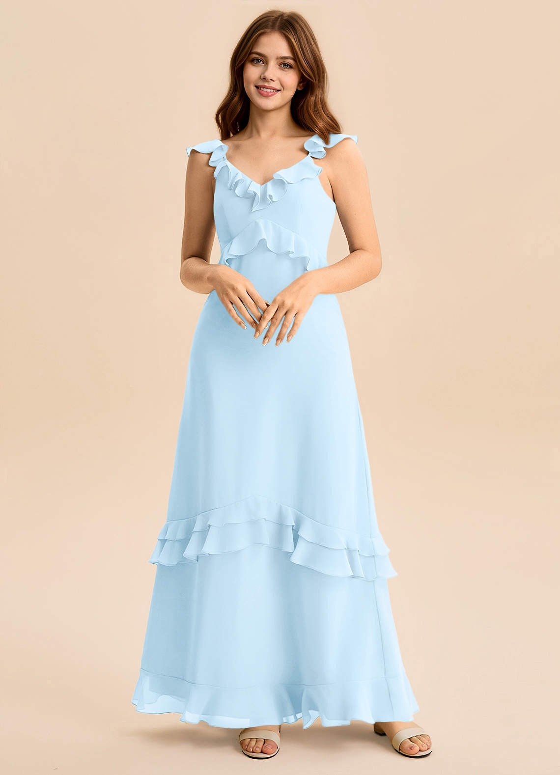 Vestido de Azul Cielo de Gasa de Corte en A con Volante