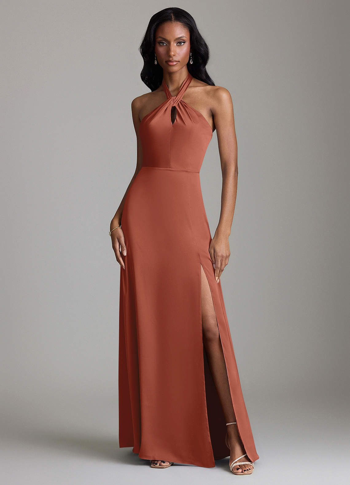 Vestido de Castaño de Satén Elástico de Corte en A con Corte Lateral