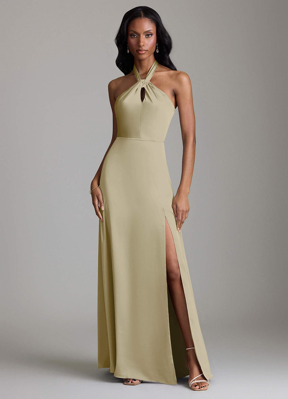 Vestido de Musgo Verde de Satén Elástico de Corte en A con Corte Lateral