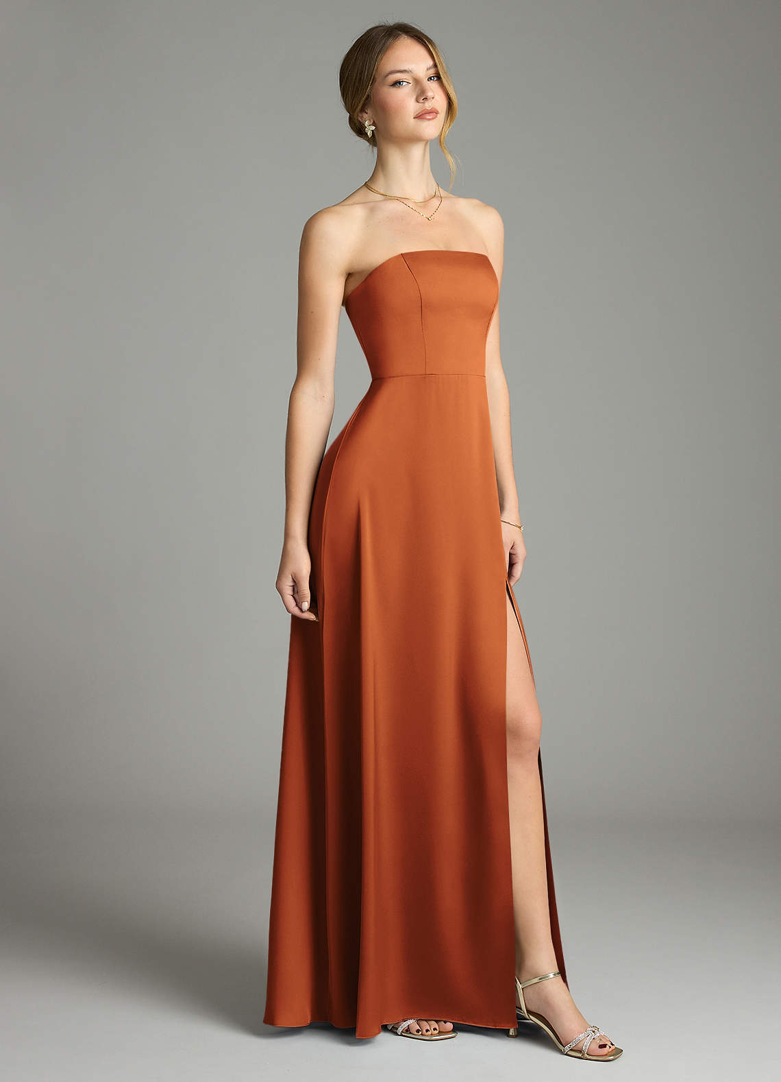 Vestido de Canela de Satén Elástico de Corte en A Convertible con Sin tirantes