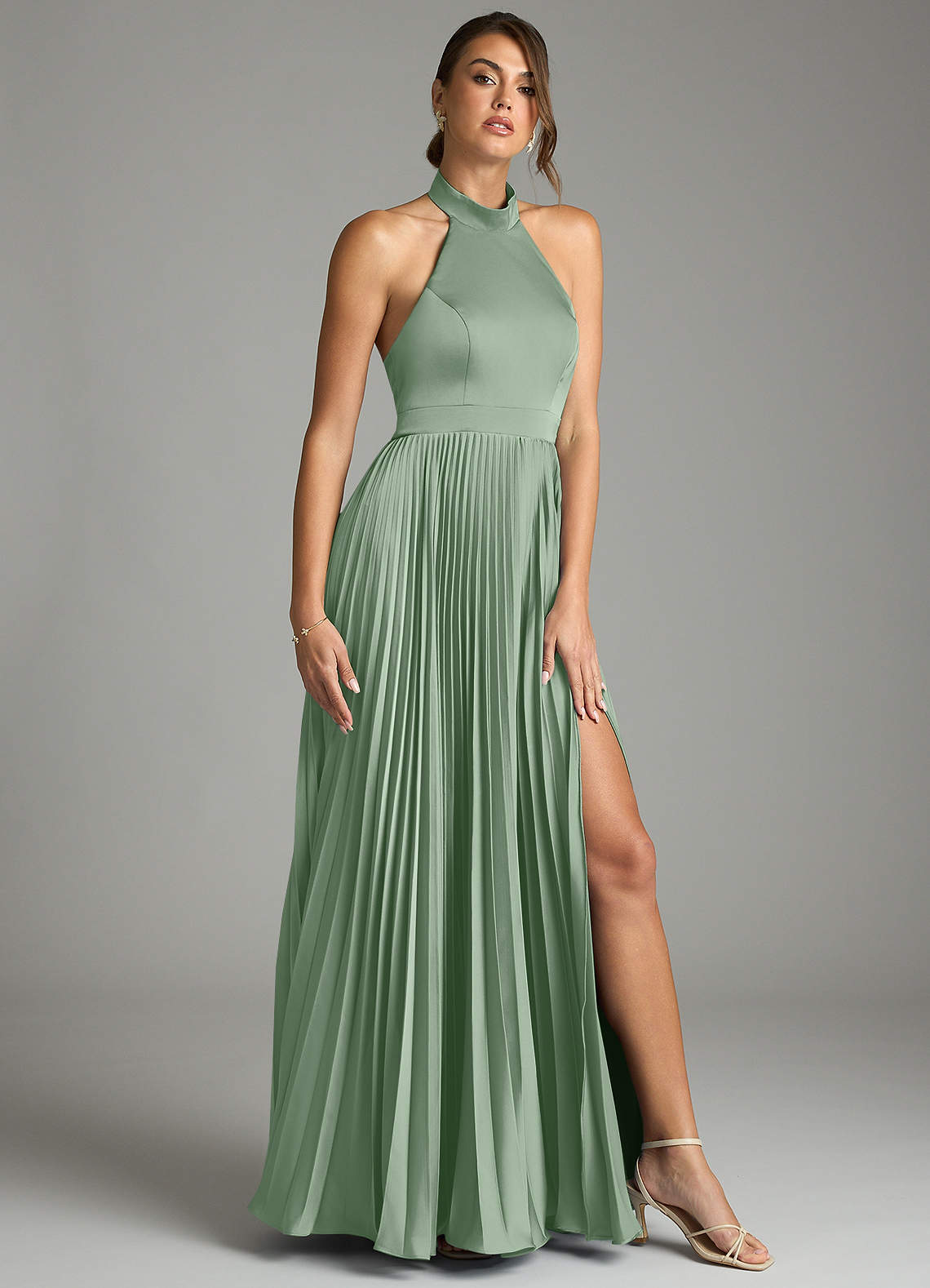Vestido de Matcha de Satén Elástico de Corte en A con Plisado