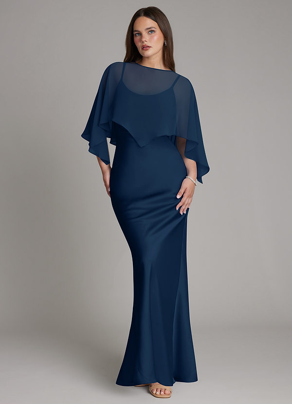Vestido de Azul Marino Oscuro de Satén Elástico de Corte Sirena con Plisado