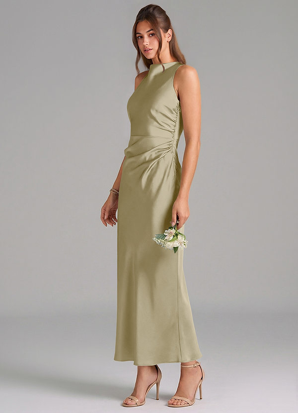 Vestido de Musgo Verde de Satén Elástico de Corte Recto con Hombro unilateral