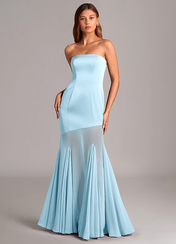 Vestido de Azul Cielo de Satén Elástico de Corte Sirena con Sin tirantes