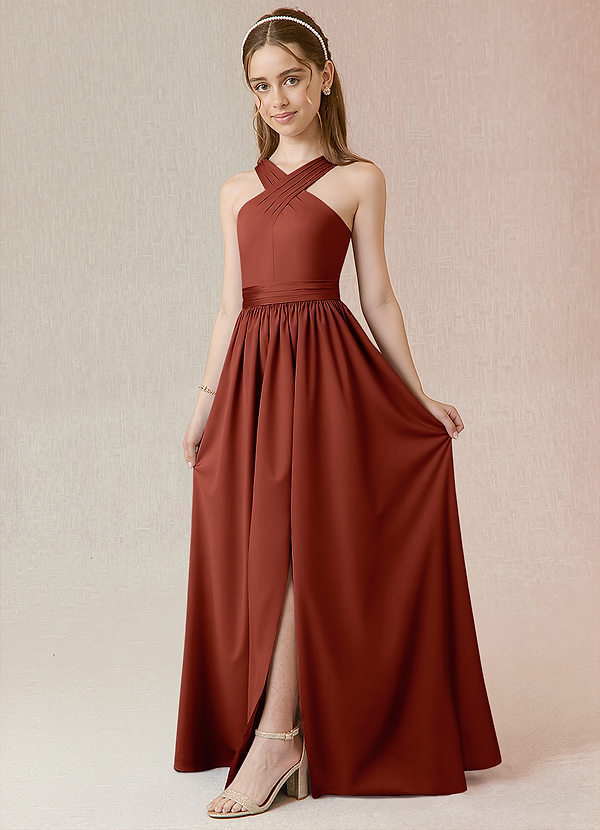 Vestido de Terracota de Satén Elástico de Imperio con Plisado