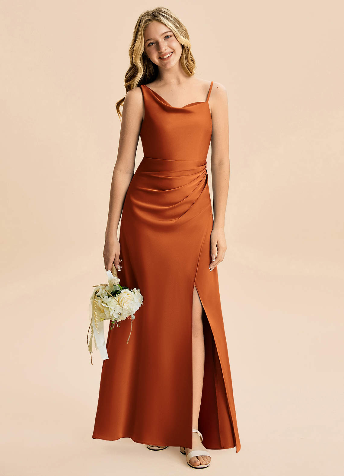 Vestido de Canela de Satén Elástico de Corte en A con Plisado