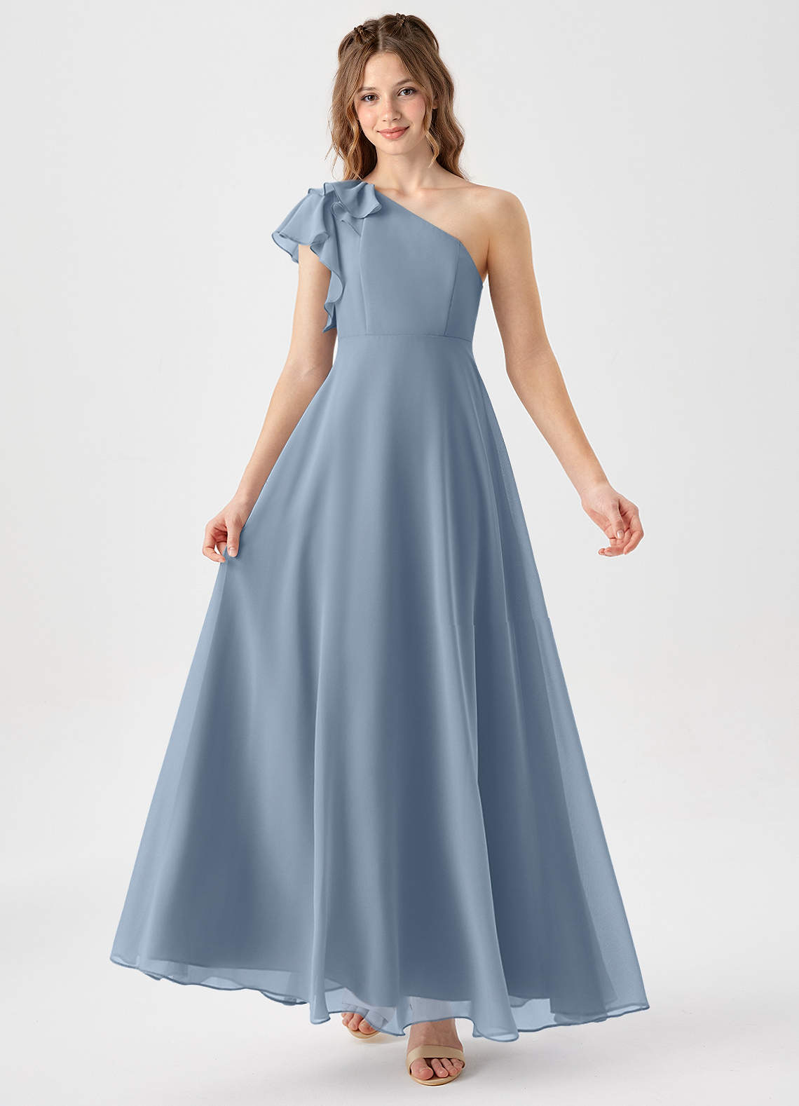 Vestido de Azul Polvoriento de Gasa de Corte en A con Volante
