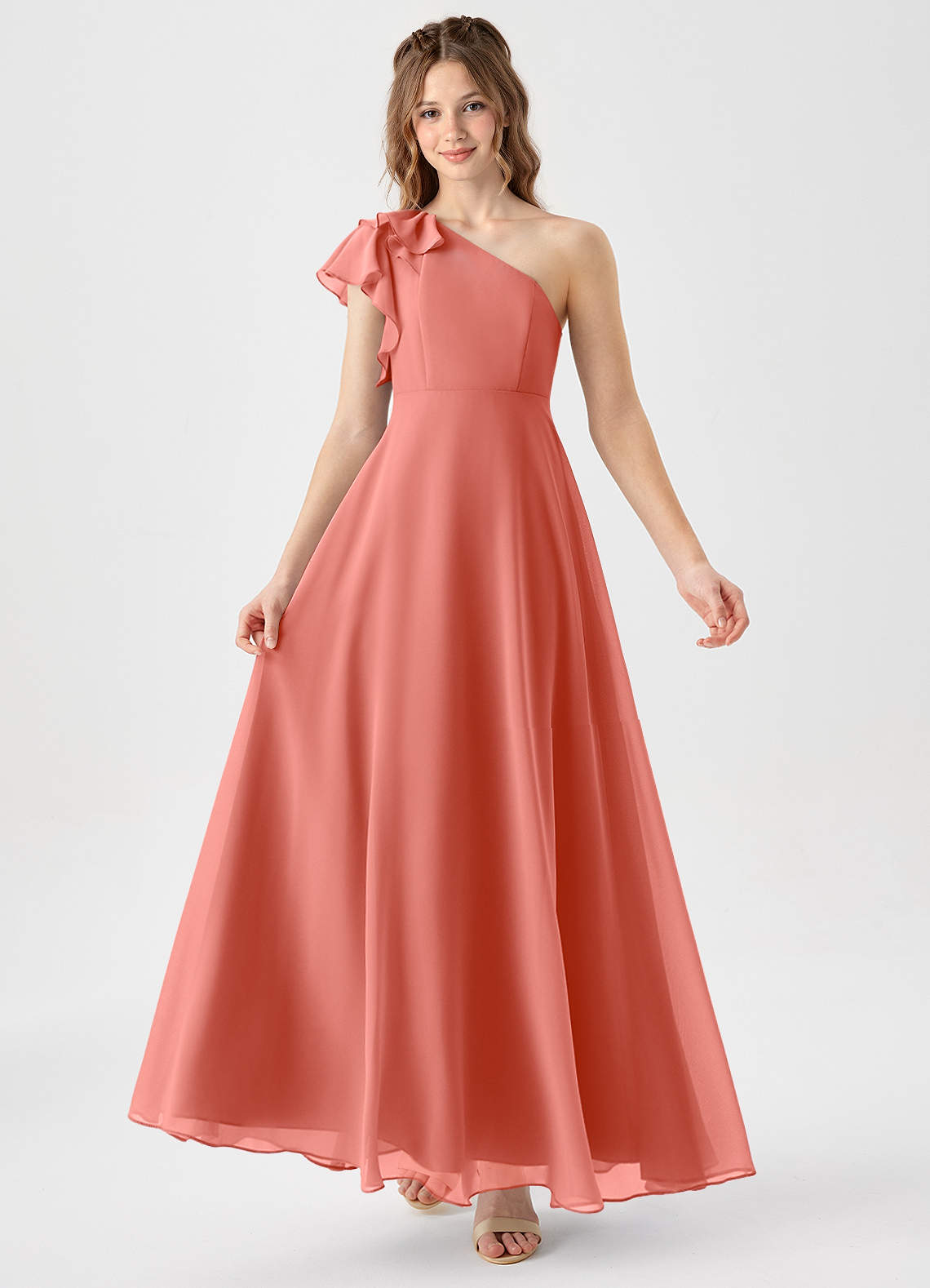 Vestido de Rosa Salmón de Gasa de Corte en A con Volante