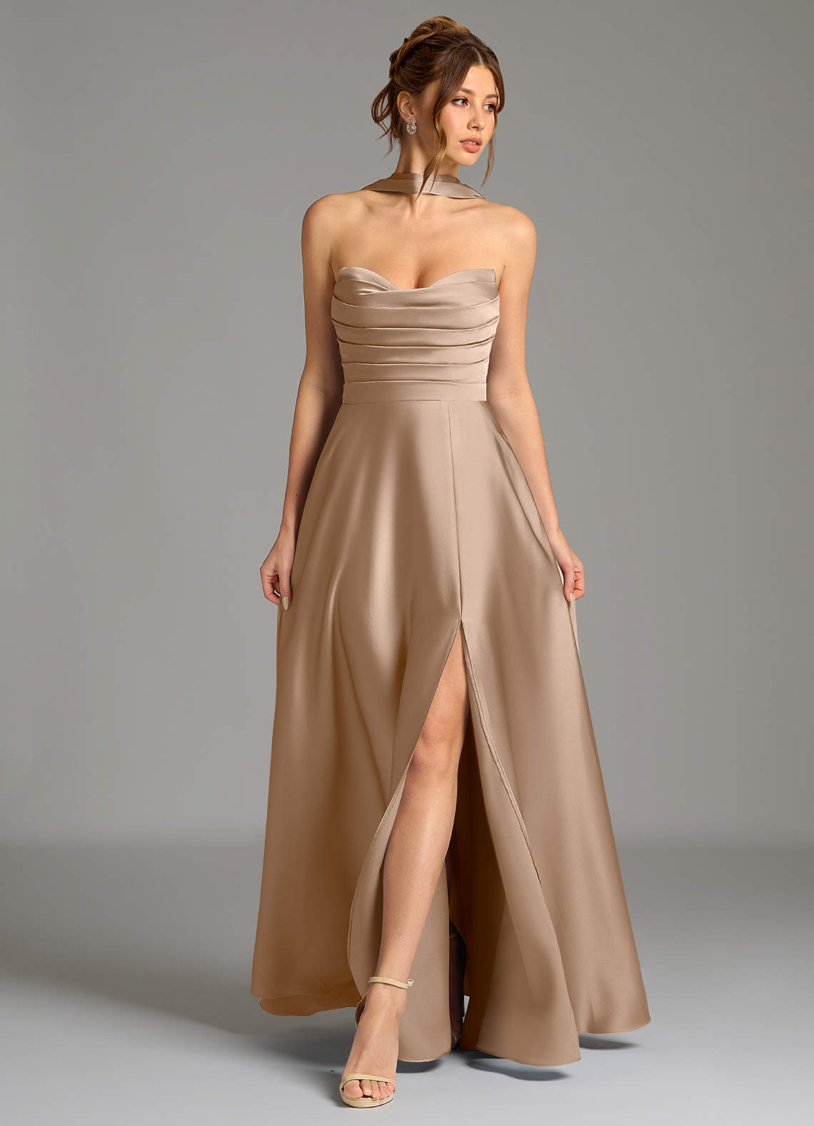 Vestido de Gris Pardo de Satén Elástico de Corte en A con Corsé