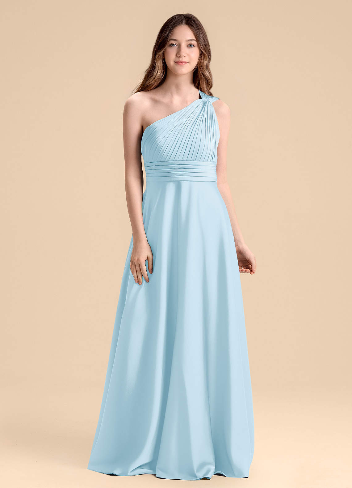 Vestido de Azul Cielo de Satén Elástico de Corte en A con Plisado