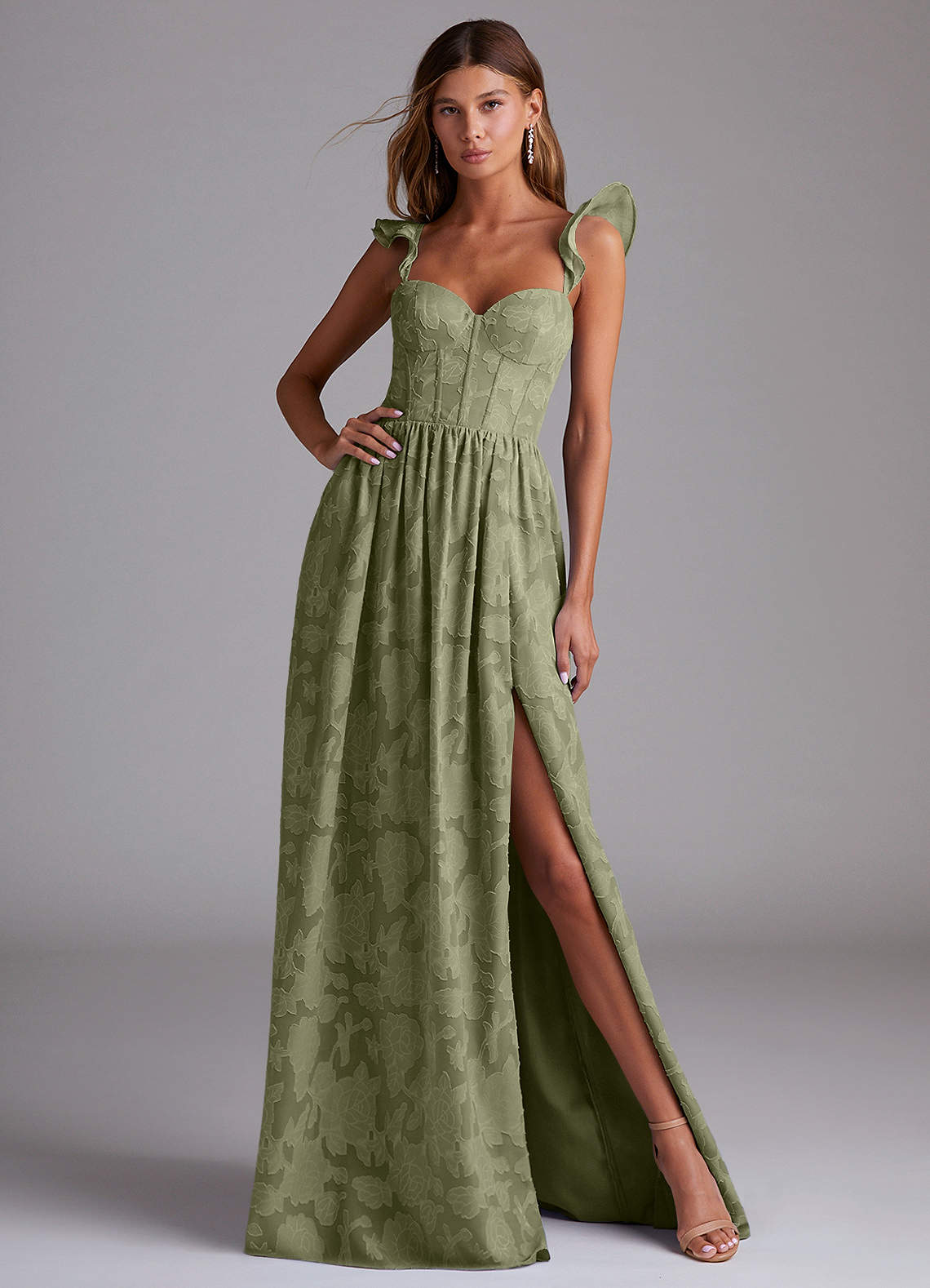 Vestido de Pistacho de Devorado Floral de Corte en A con Volante
