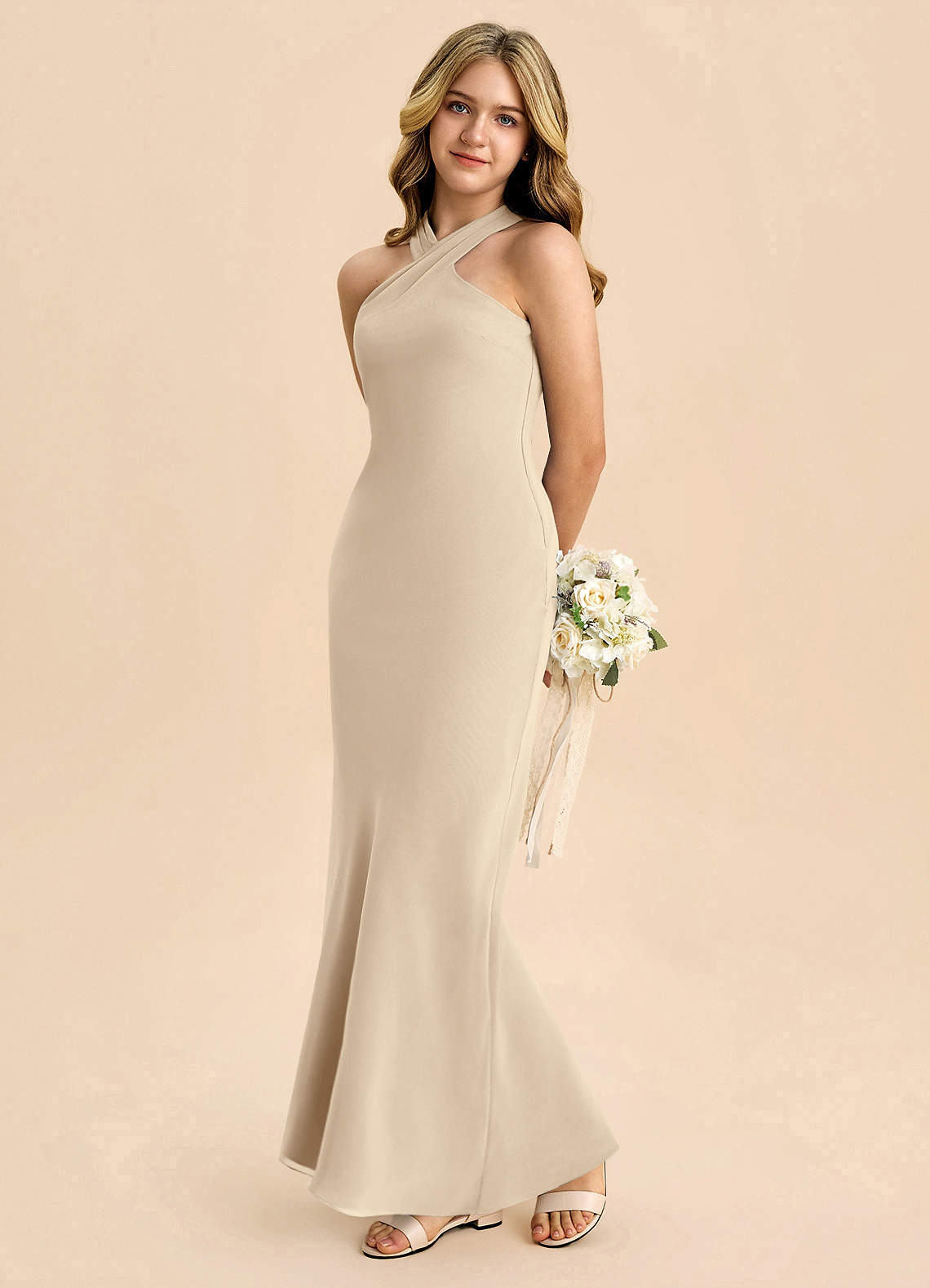 Vestido de Champán de Gasa de Corte Recto con Plisado
