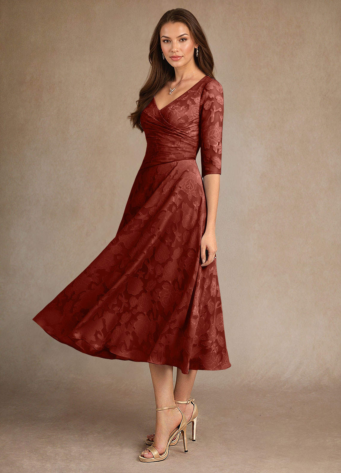 Vestido de Terracota de Devorado Floral de Corte en A con Plisado