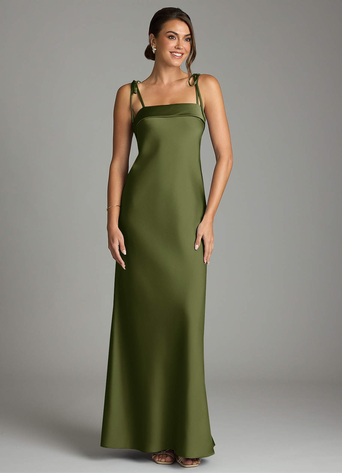 Vestido de Oliva de Satén Elástico de Corte Recto con Lazo