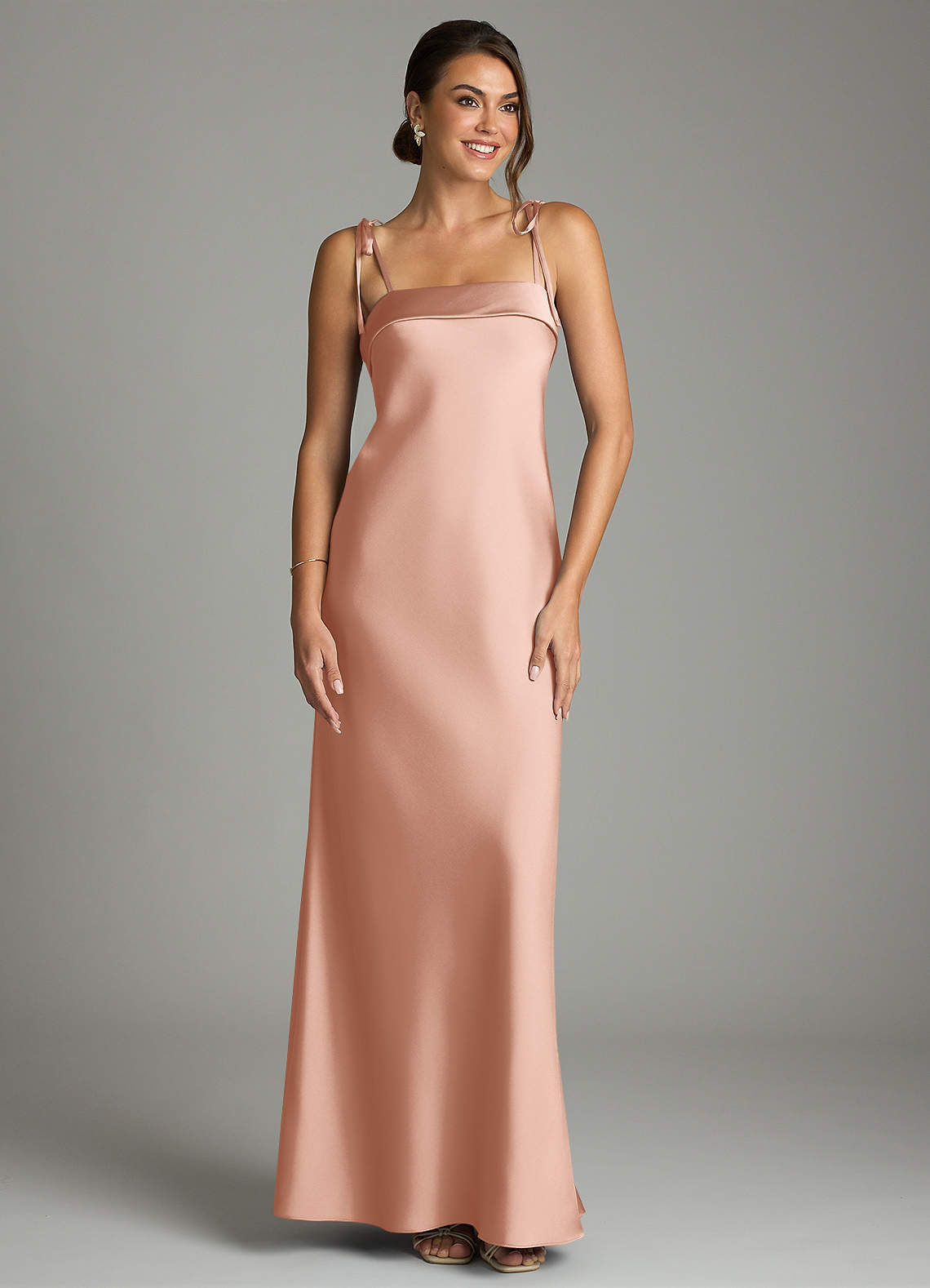 Vestido de Oro Rosa de Satén Elástico de Corte Recto con Lazo
