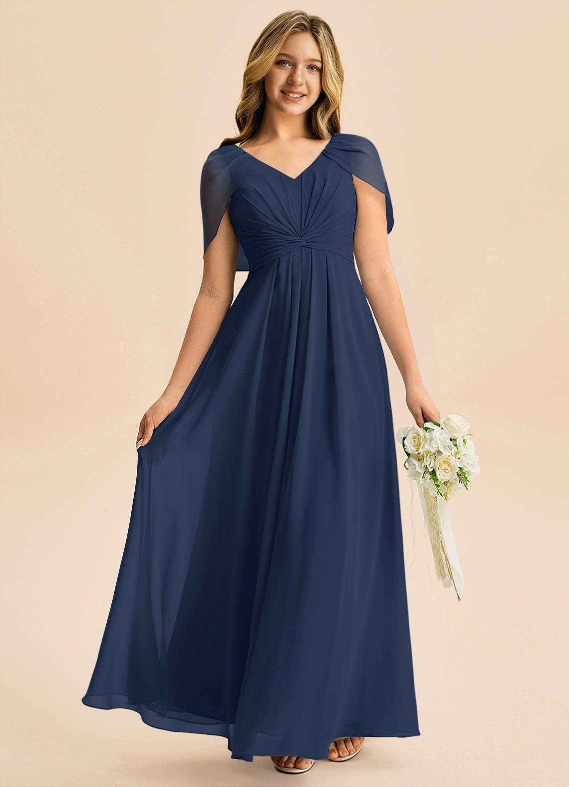 Vestido de Azul Marino Oscuro de Gasa de Corte en A con Plisado