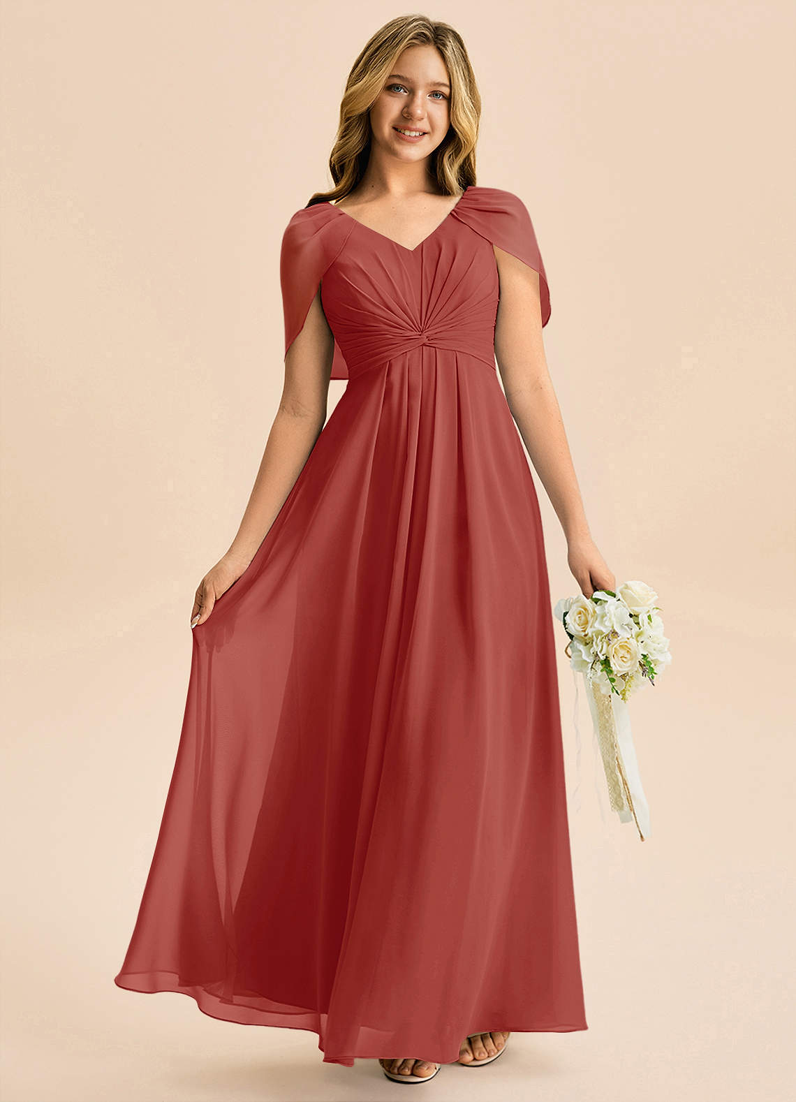 Vestido de Terracota de Gasa de Corte en A con Plisado