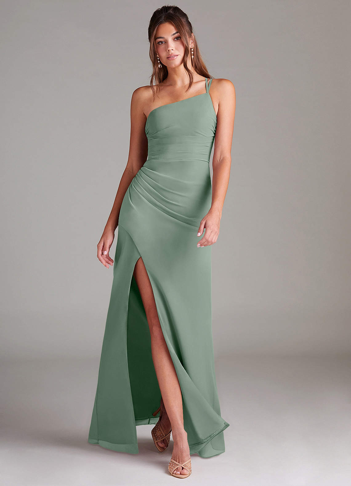 Vestido de Salvia Plateada de Gasa de Corte Recto con Hombro unilateral