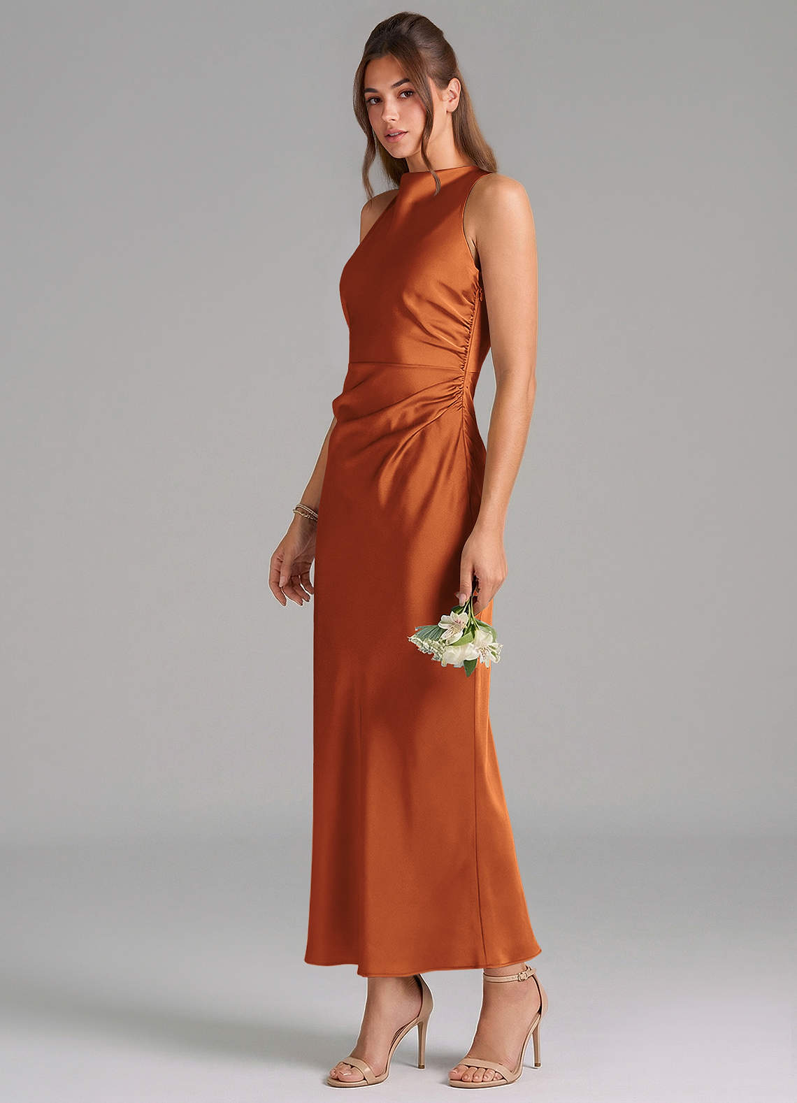 Vestido de Canela de Satén Elástico de Corte Recto con Plisado