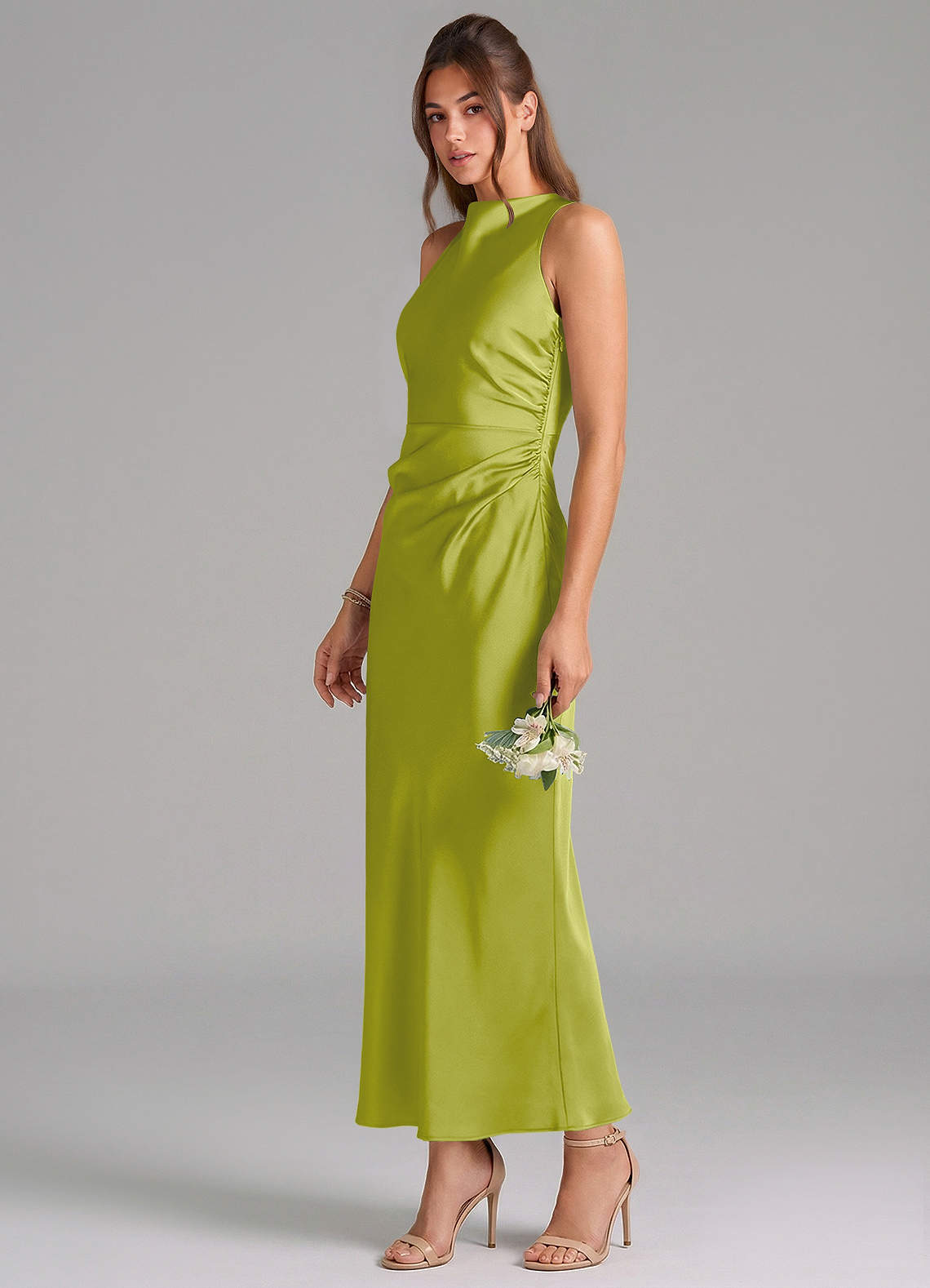 Vestido de Hierba De Limón de Satén Elástico de Corte Recto con Plisado