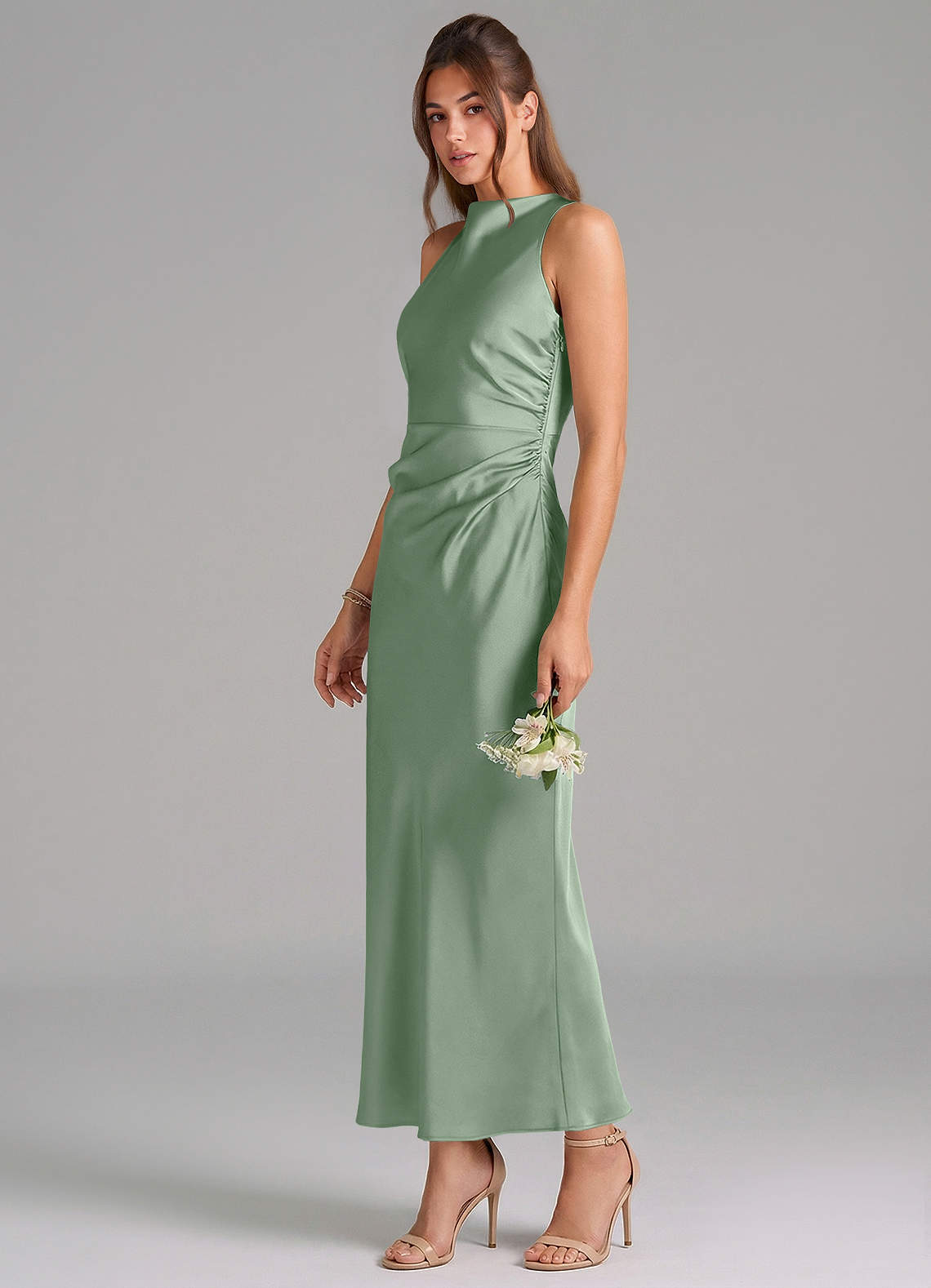 Vestido de Matcha de Satén Elástico de Corte Recto con Plisado