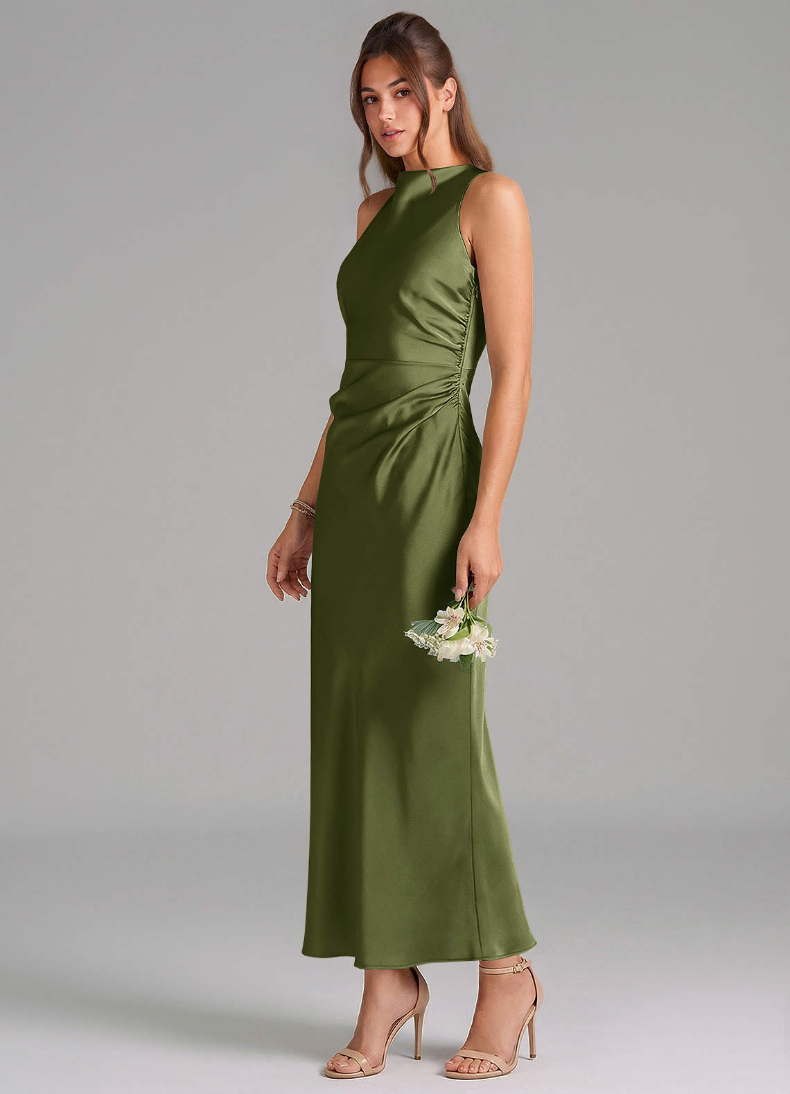 Vestido de Oliva de Satén Elástico de Corte Recto con Plisado