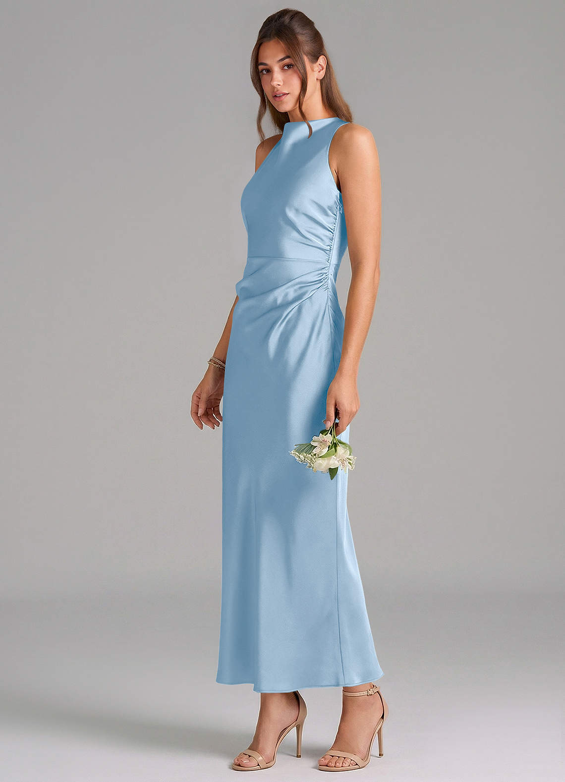 Vestido de Azul Pálido de Satén Elástico de Corte Recto con Plisado